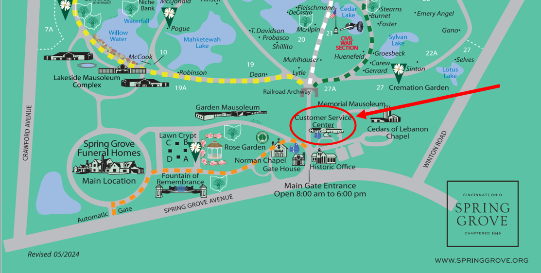 We will be meeting at Spring Grove’s Customer Service Center  at 10:00 am. A full grounds map of Spring Grove Cemetery and Arboretum can be found here